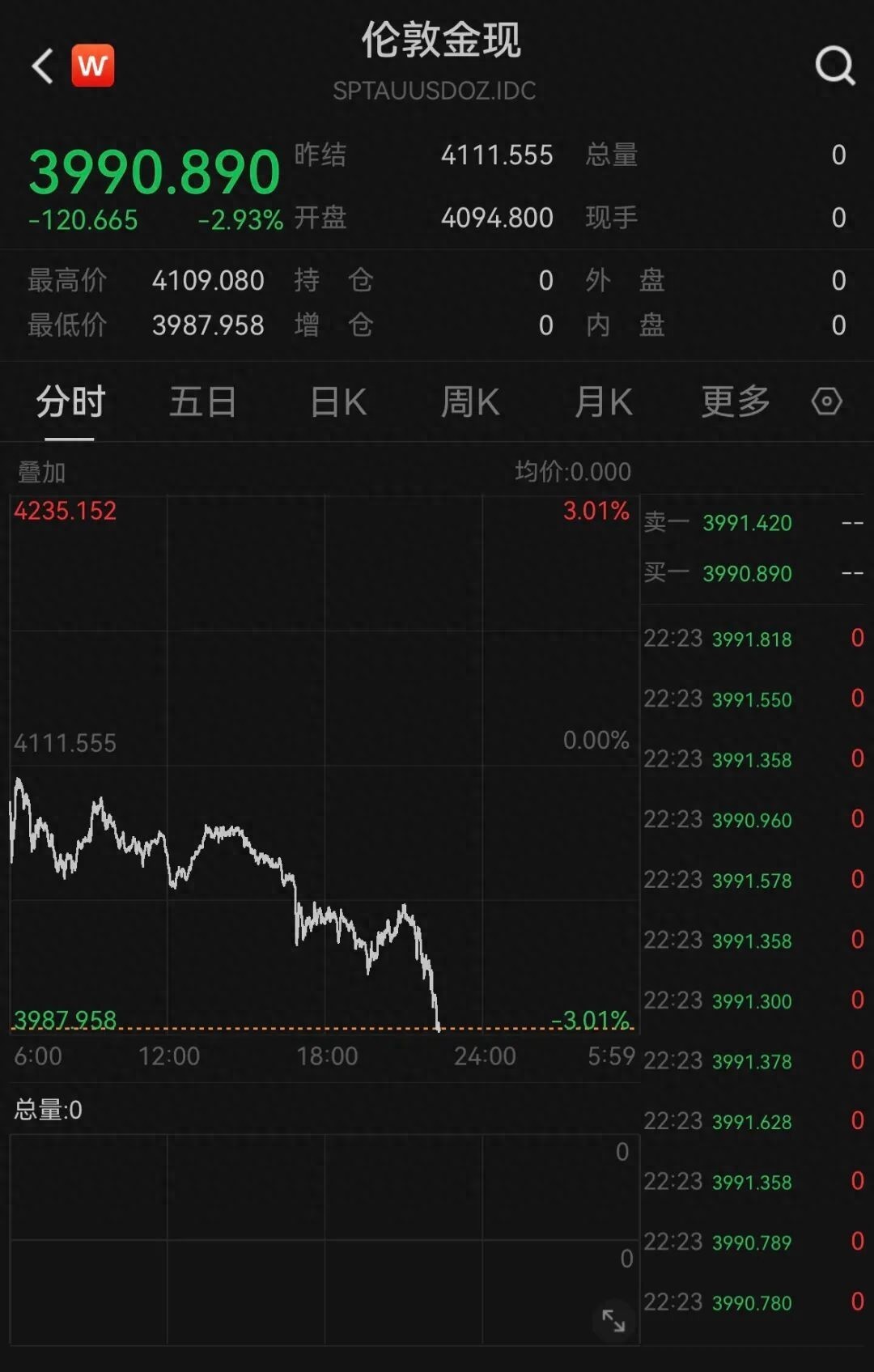 北京时间10月27日晚,现货黄金盘中跳水,跌破4000美元关口。截至发稿报3990.890美元/盎司,跌2.93%。